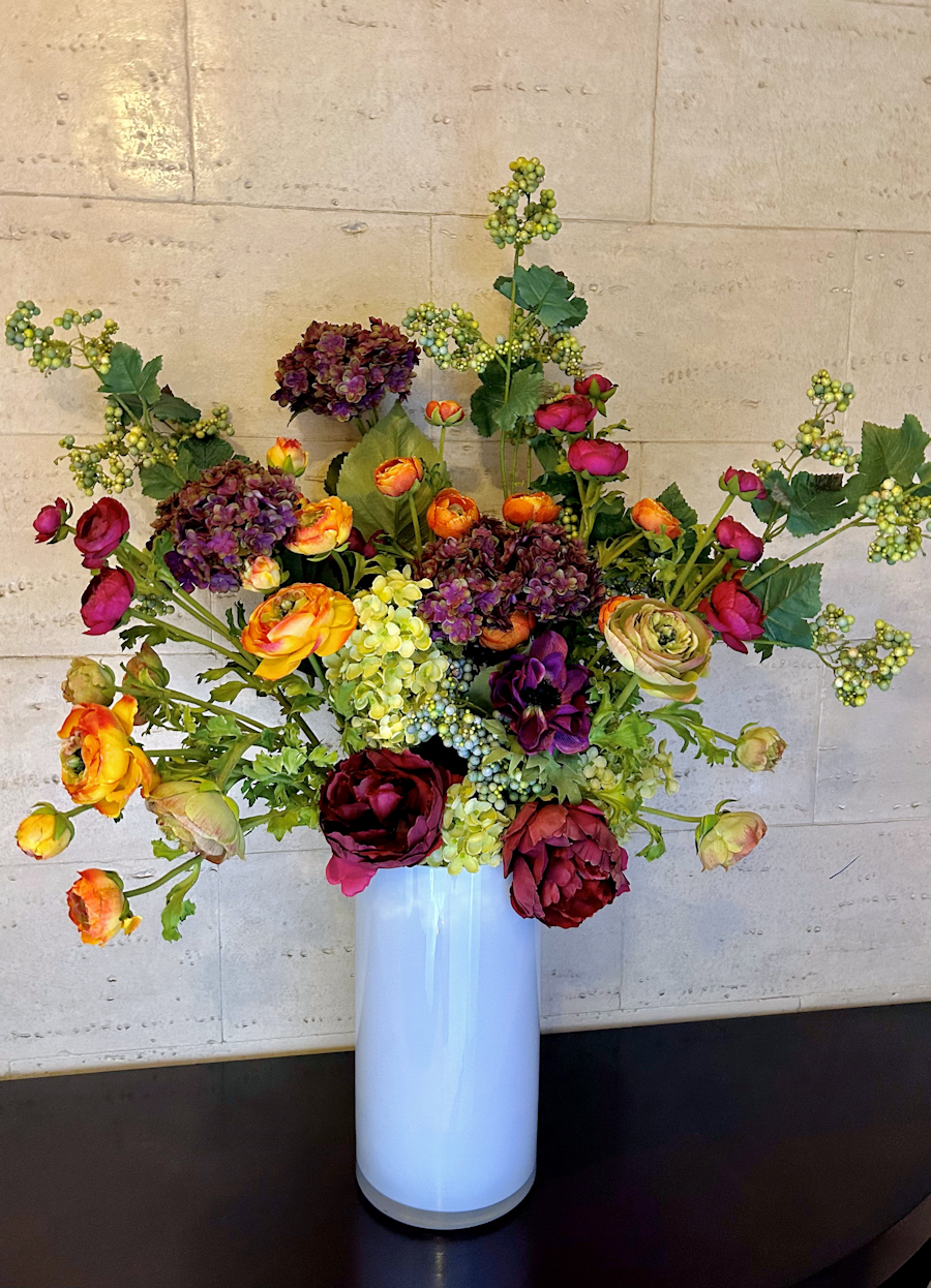 Julie will work with you to create an arrangement that reflects your decor and personal preferences. Take a look below at the custom arrangements designed using her client’s vase or container.
